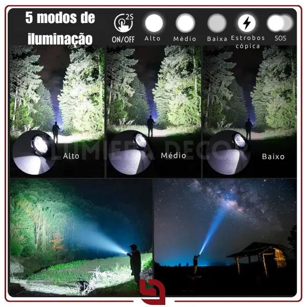 Iluminação extrema: LED de alta potência oferece alcance de luz ampla ou focada, ideal para emergências, buscas, atividades noturnas e acampamentos.