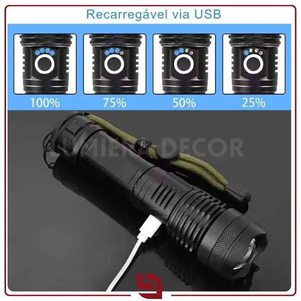 Oferece luz forte com ajuste de foco (zoom telescópico), corpo robusto em liga de alumínio, bateria recarregável e recarga USB para máxima eficiência e durabilidade em qualquer ambiente – da trilha ao dia a dia.