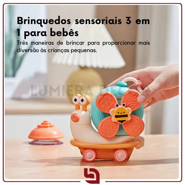 Com design de caracol sorridente, hélice colorida em formato de flor com abelhinha e ventosa ultraforte, fixa em cadeirão, vidro, azulejo, mesa ou qualquer superfície lisa, girando suavemente e produzindo sons delicados para promover foco, coordenação e diversão em qualquer ambiente.
