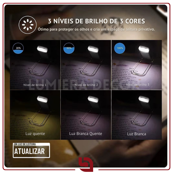 BookGlow – Luz de Leitura USB com Clipe, Ajuste de Brilho e Proteção Ocular
